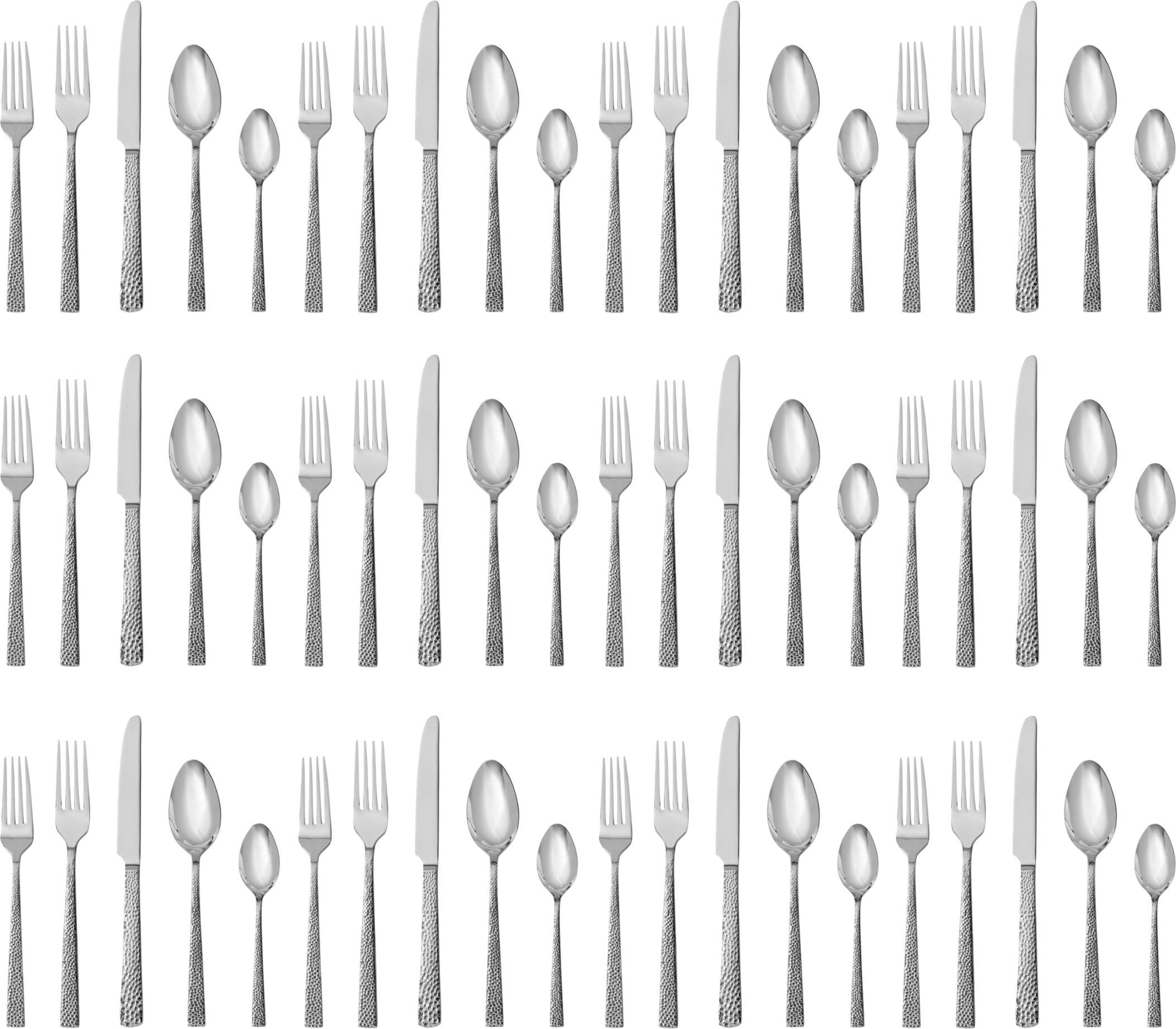 Elevate your dining setup with the Fortessa Nomad 60 Pc Flatware Set, where rugged texture meets contemporary style. Designed with a distinctive hammered handle and finished in satin, this flatware brings an industrial revival aesthetic to your table. Crafted from durable 18/0 stainless steel, the Nomad collection is ideal for everyday dining or entertaining, offering a perfect balance of visual appeal, tactile comfort, and long-lasting performance.