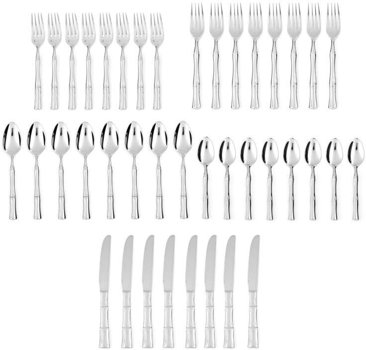 - Includes service for 8 (dinner forks, salad forks, dinner knives, soup spoons, teaspoons)