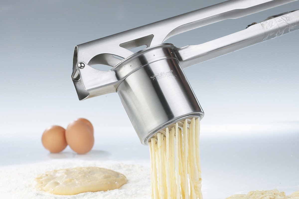 Potato and spaetzle-press with 3 exchangeable perforated discs for professional handling and versatile use. The perforated discs can be changed quickly and comfortably. With 25 mm perforation for potatoes, vegetable and fruit, with 30 mm perforation as nozzle for long spaetzle and ice cream “spaghetti style” and with special perforation for spaetzle “hand made style”. Professional quality.