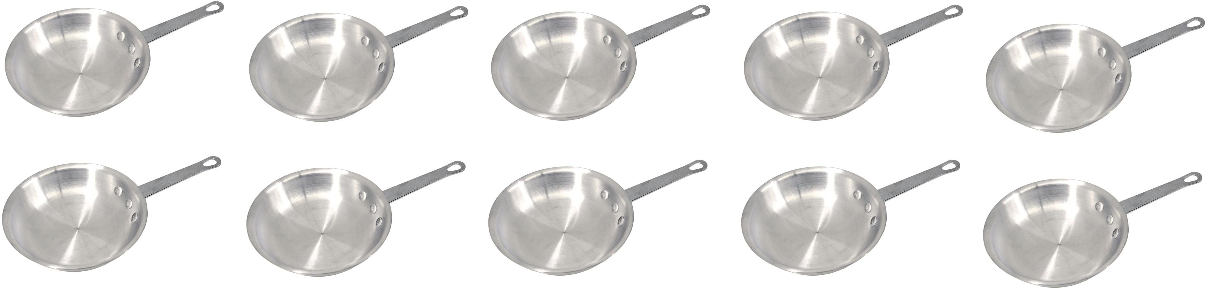This fry pan is made of heavy gauge reinforced premium aluminum and is the perfect solution for quickly making fajitas, omelettes, pasta dishes, and everything in between! With a shallow, curved-wall design and sturdy aluminum construction, this pan allows for easy stirring and prevents steam from forming in the pan. The aluminum construction allows for even heat distribution throughout the cooking process. Optional silicone cool-handle sleeve sold separately item #43340.
