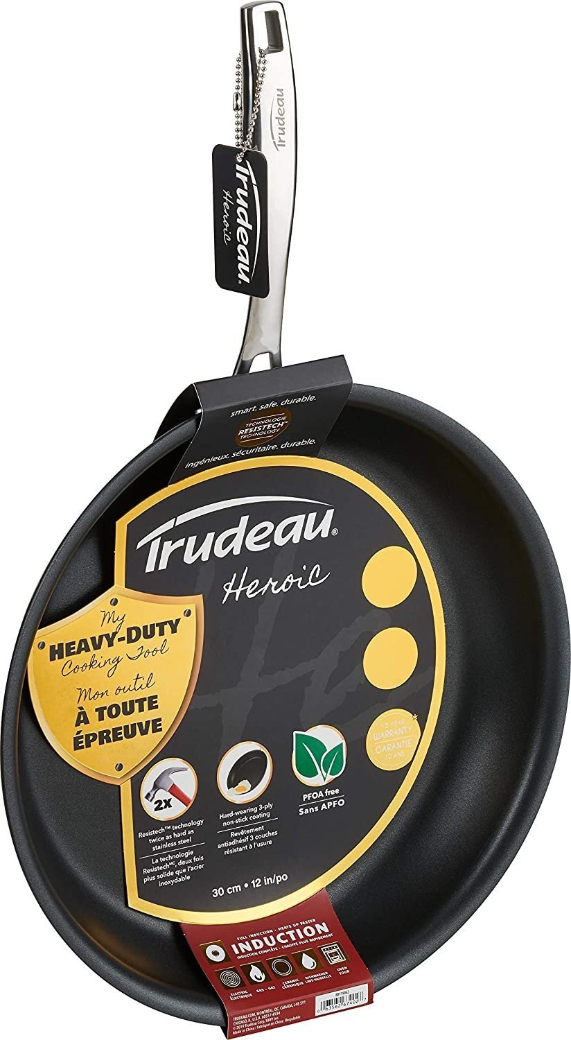 The Trudeau Heroic 10" Frying Pan features Trudeau Resistech technology to ensure maximum fusion of the non- stick surface coating to the hard-anodized aluminum. This smart, safe and durable frying pan is twice as hard as stainless steel pan and prevents warping and buckling for long-lasting protection and dependability.