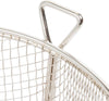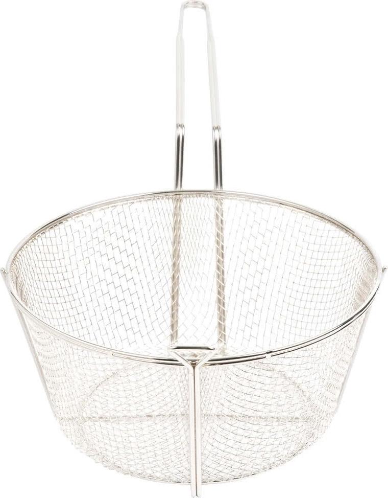 This round fry basket has a corrosion-resistant nickel-plated finish and features a reinforced base for extra strength. Long 9" handle to help protect your hand. Perfect for commercial kitchens, catering companies and hotels.