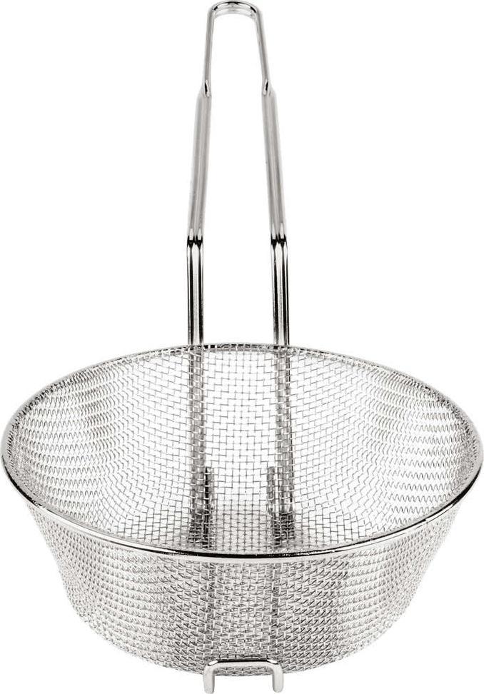 This culinary basket is made of corrosion-resistant nickel-plated steel. It is perfect for deep frying food. This fine mesh is ideal for lightly-battered food.