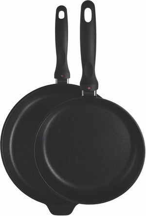 The cookware's pressure-cast aluminum construction provides for uniform heat distribution with no hot spots or warping - even if the pan is placed under cold running water right off the stove. Each piece has a perfectly flat base for use on any ceramic, gas or electric cooktop (induction series also available.)