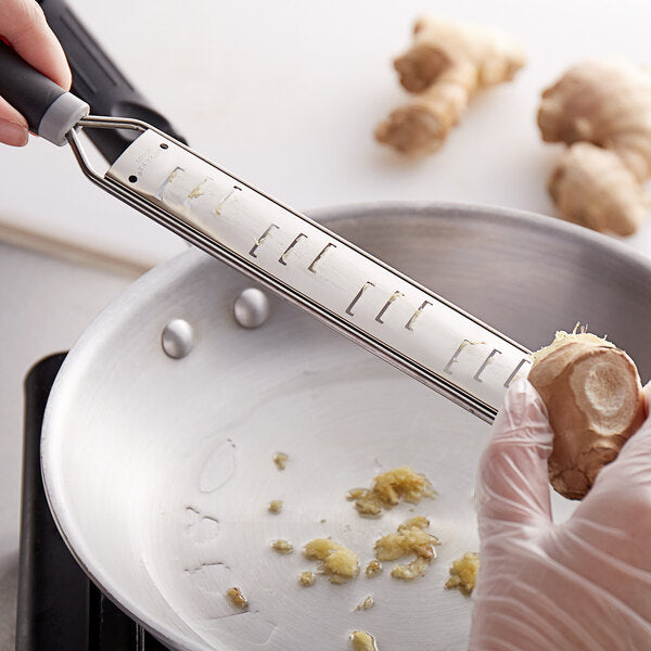 The Mercergrates™ 15" X 1.18" Stainless Steel Narrow Shaver, the ultimate tool for precision slicing and shredding in your kitchen. Crafted with meticulous attention to detail, this narrow shaver boasts acid-etched 18-8 stainless steel blades, ensuring an exceptionally sharp cutting surface that maintains its edge over time. Designed for comfort and control, the shaver features a rounded ergonomic handle made from durable polypropylene and slip-resistant Santoprene®, allowing for extended use without fatigue. The addition of a silicone stability bar enhances stability by providing a non-slip surface to rest on any work surface, ensuring steady and precise cuts every time. For added convenience, the shaver comes equipped with a hanging hole, allowing for easy storage and accessibility in your kitchen space. Plus, the snap-on cover ensures safety during storage, keeping the blades protected and your kitchen organised. Experience the unmatched quality and versatility of the Mercergrates™ 15" X 1.18" Stainless Steel Narrow Shaver – the essential tool for achieving professional-grade results in your culinary creations.