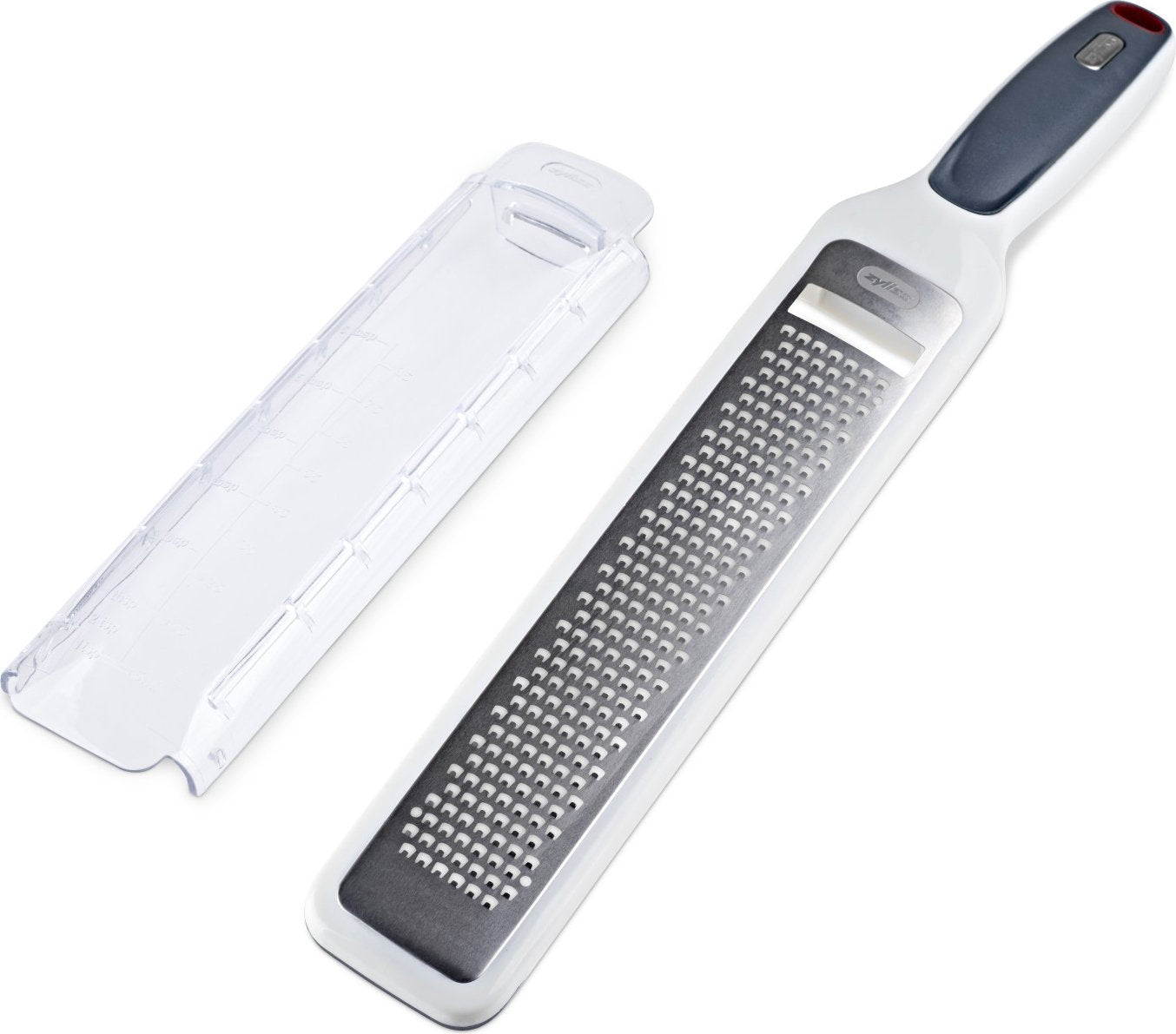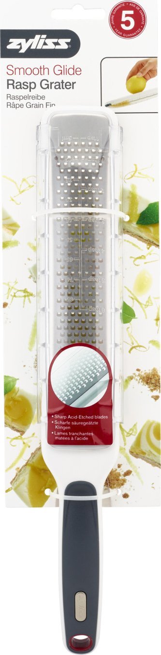 The Zyliss SmoothGlide Rasp Grater is perfect for zesting citrus and grating nutmeg, chocolate and ginger. It has an acid-etched razor sharp blade for quick and easy grating. Features include a protective cover that clips under the blade to collect food as you grate and an integrated scraper to clean the blade easily. Ergonomic handle and non-slip tip. The Rasp Grater is easy to clean and dishwasher safe.