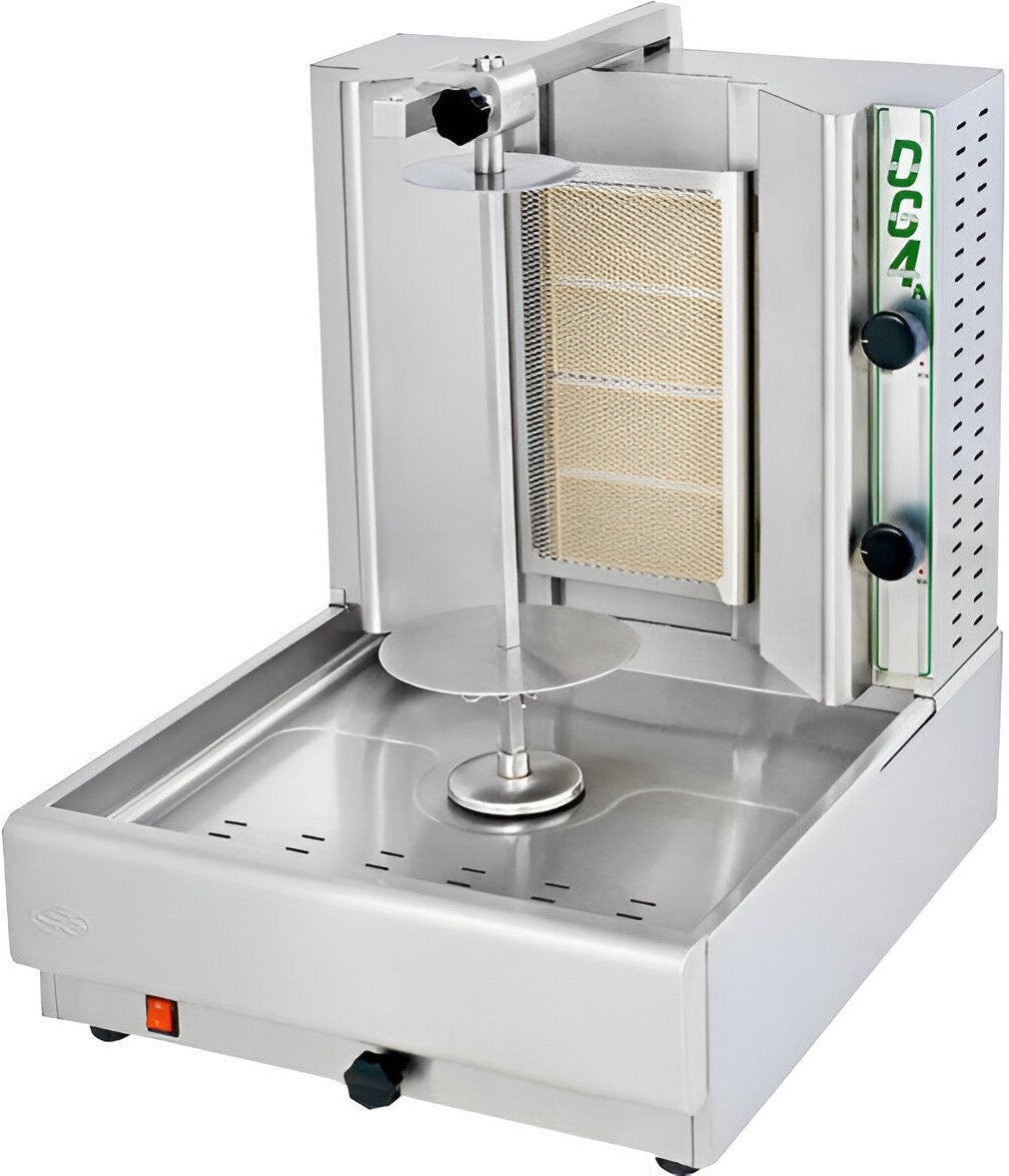 Esthetically the nicest Gyro in the marketplace today (in our opinion, of course!). Designed with the motor at the bottom of the unit, it ensures protection from all heating elements. Individual burner controls, ceramic plates with minimum flame adjustment, removable burner protection mesh, removable drip tray, plug for electric knife, and a shovel for the meat are ALL standard features of our Visvardis gyro machines. In addition to the features and benefits, our gyro machines allow the user to MOVE the burner closer/farther away from the meat (instead of moving the spit) to ensure precise cooking with minimal heat loss (this is accomplished by pulling/pushing the knob located in the front of the machines).