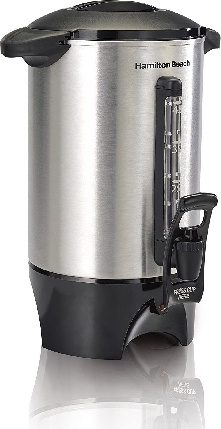 Hosting large gatherings at home? Serving crowds at a potluck or other functions? The Hamilton Beach 45 Cup Coffee Urn was made to handle a crowd. Brew anywhere from 15 to 45 cups of hot, fresh coffee. Guests will appreciate that a cup-activated dispenser makes it easy to fill cups one-handed, perfect for guests juggling plates at the end of a buffet line. A ready-to-serve indicator light lets them know coffee is ready, while a coffee level window lets you know how many cups are left. Large handles, a locking lid and dishwasher safe parts simplify the brewing process.