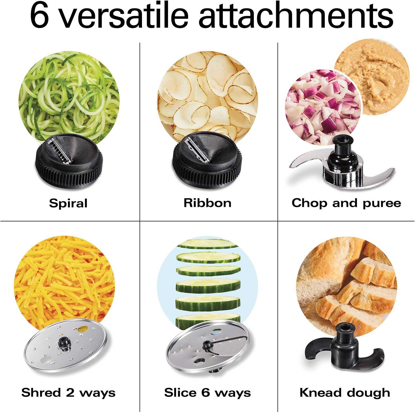 - 6 Versatile Attachments: Includes spiralizing blades for noodles and ribbons, adjustable slicing blade with 6 settings, reversible shredding blade, S-blade for chopping and pureeing, and dough blade for kneading.