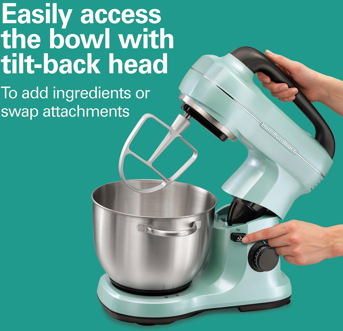 The Hamilton Beach® 4 Quart Aqua Blue 7 Speed Stand Mixer offers hands-free mixing with complete bowl coverage, making it ideal for a variety of batters and mixes. This versatile stand mixer can whip delicate meringues, mix sticky bread dough, and everything in between, thanks to its powerful 300 watt motor. The planetary mixing action rotates the beaters around the entire bowl for even and complete mixing, so you never have to scrape the bowl or hand-mix at the end. Seven speeds allow you to go from a slow stir to a fast mix with exact control at each one. The mixing guide on the mixer's top helps you choose the right speed for various mixing methods. The tilt-up head design makes it easy to add ingredients and change attachments quickly. Nonslip feet keep the mixer stable during use, and the splatter shield helps prevent messy drips, drops, and spills.