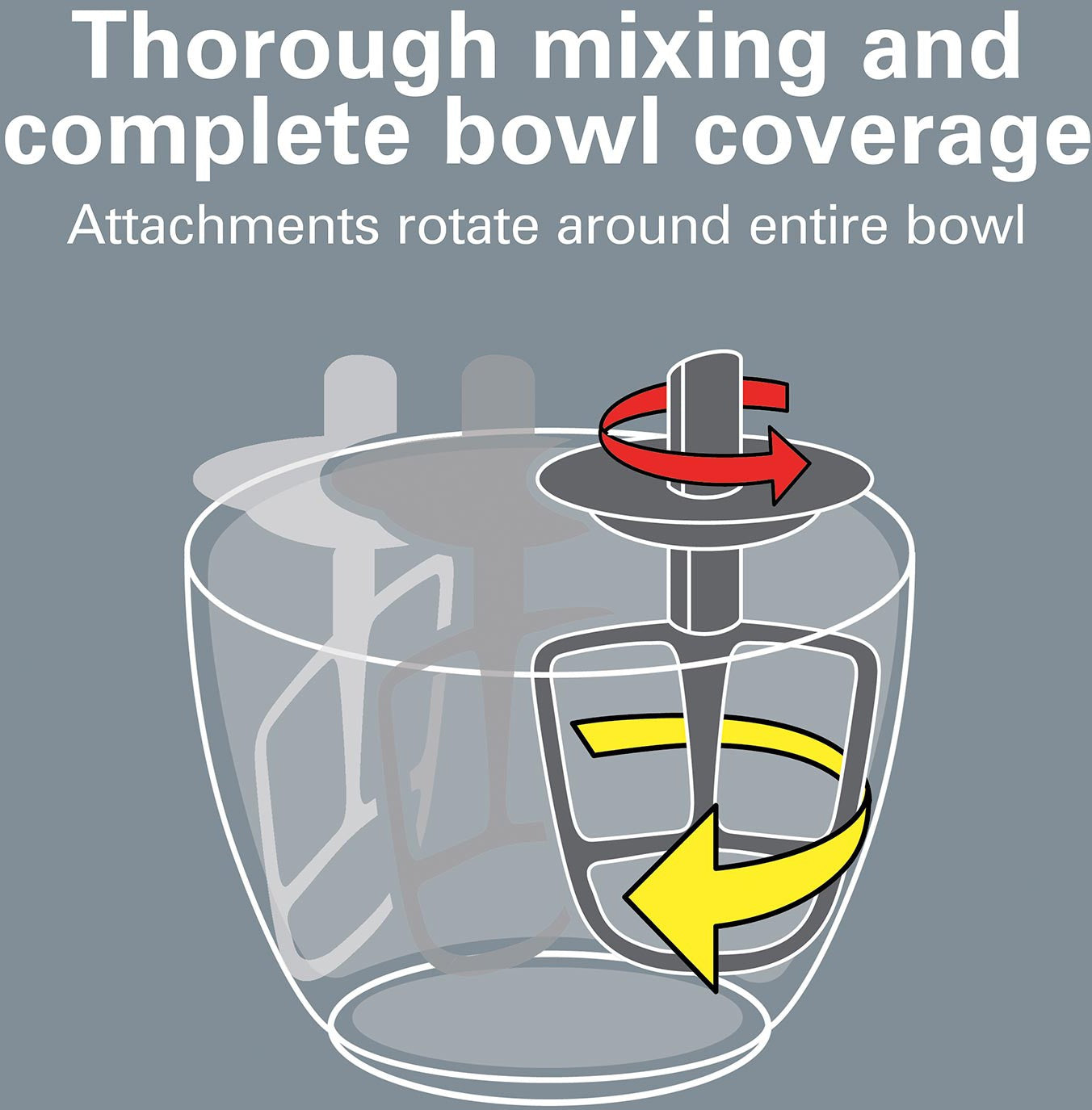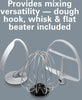 - Provides mixing versatility — dough hook, whisk & flat beater included