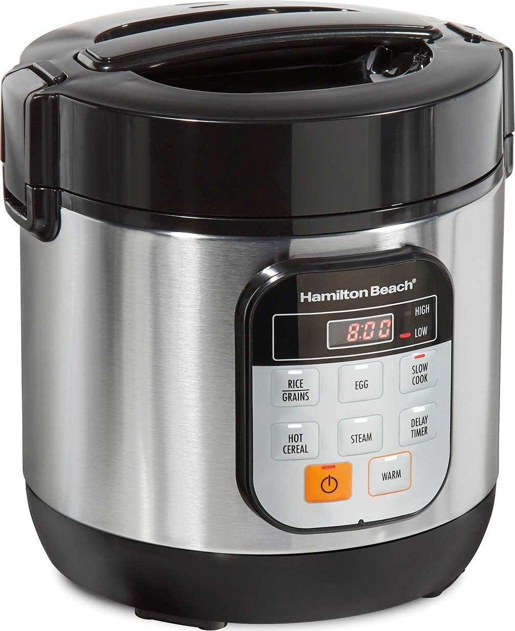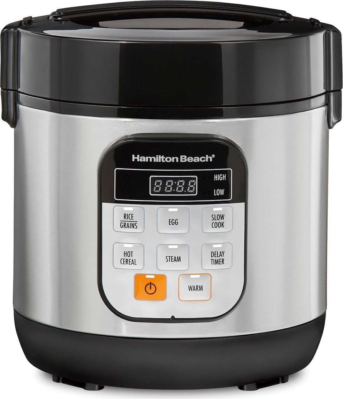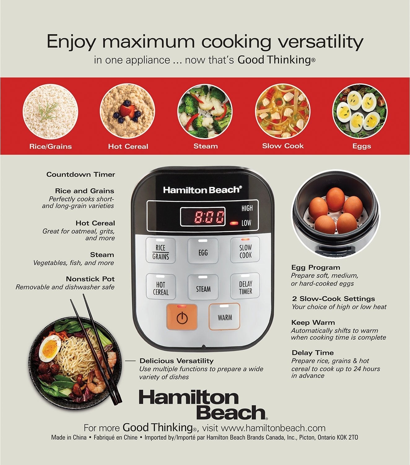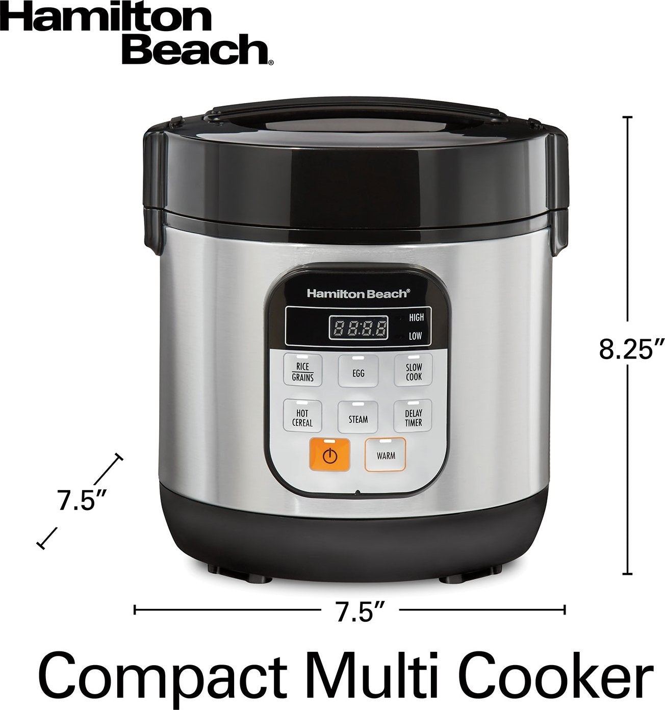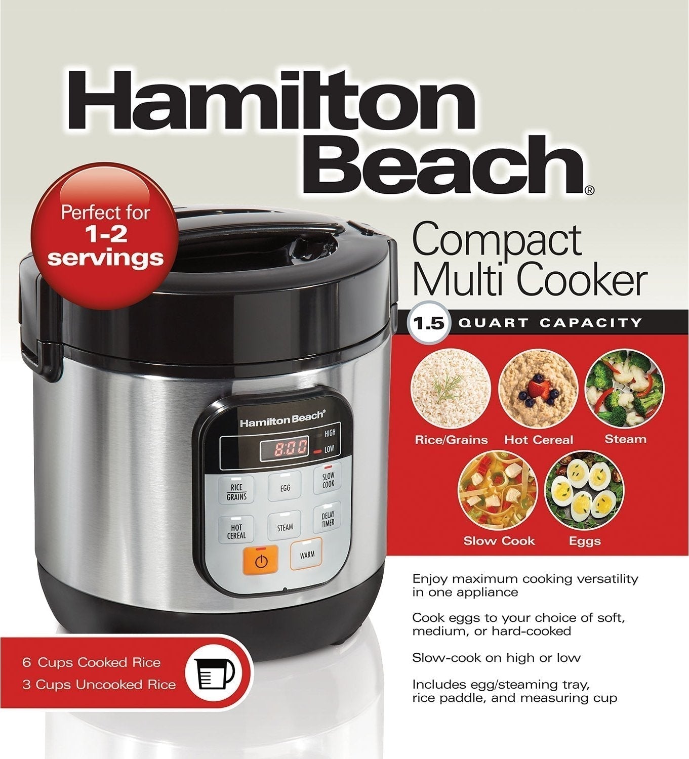 Save storage space while enjoying complete cooking flexibility with the Hamilton Beach Compact Multi Cooker. Combining the functions of a rice cooker, egg cooker, slow cooker, steamer and more, this multi cooker is perfect for making a variety of dishes in a single pot. The 1.5 quart capacity is perfect for making enough for 1-2 people and for kitchens where space is limited. An egg/steaming tray, rice paddle and measuring cup are included.