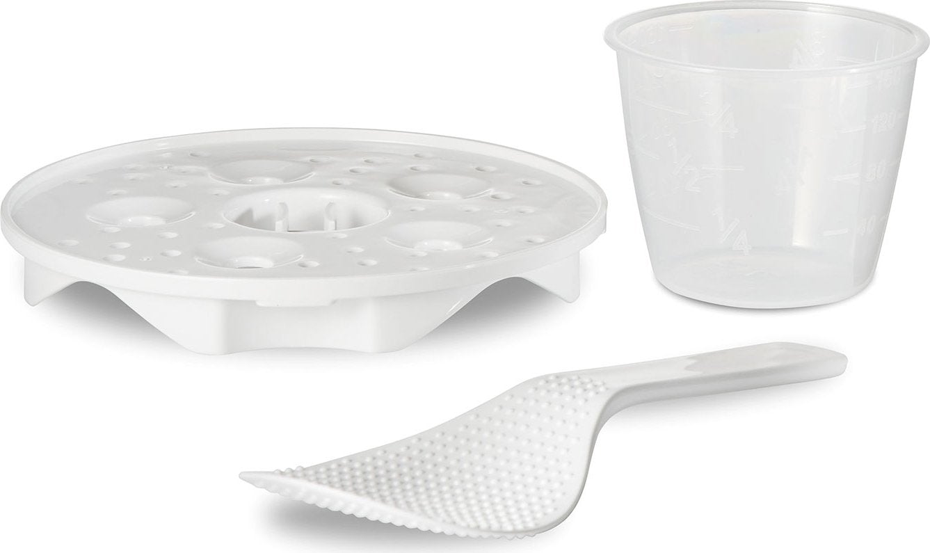• Includes egg/steaming tray, rice paddle, and measuring cup