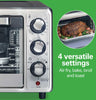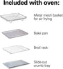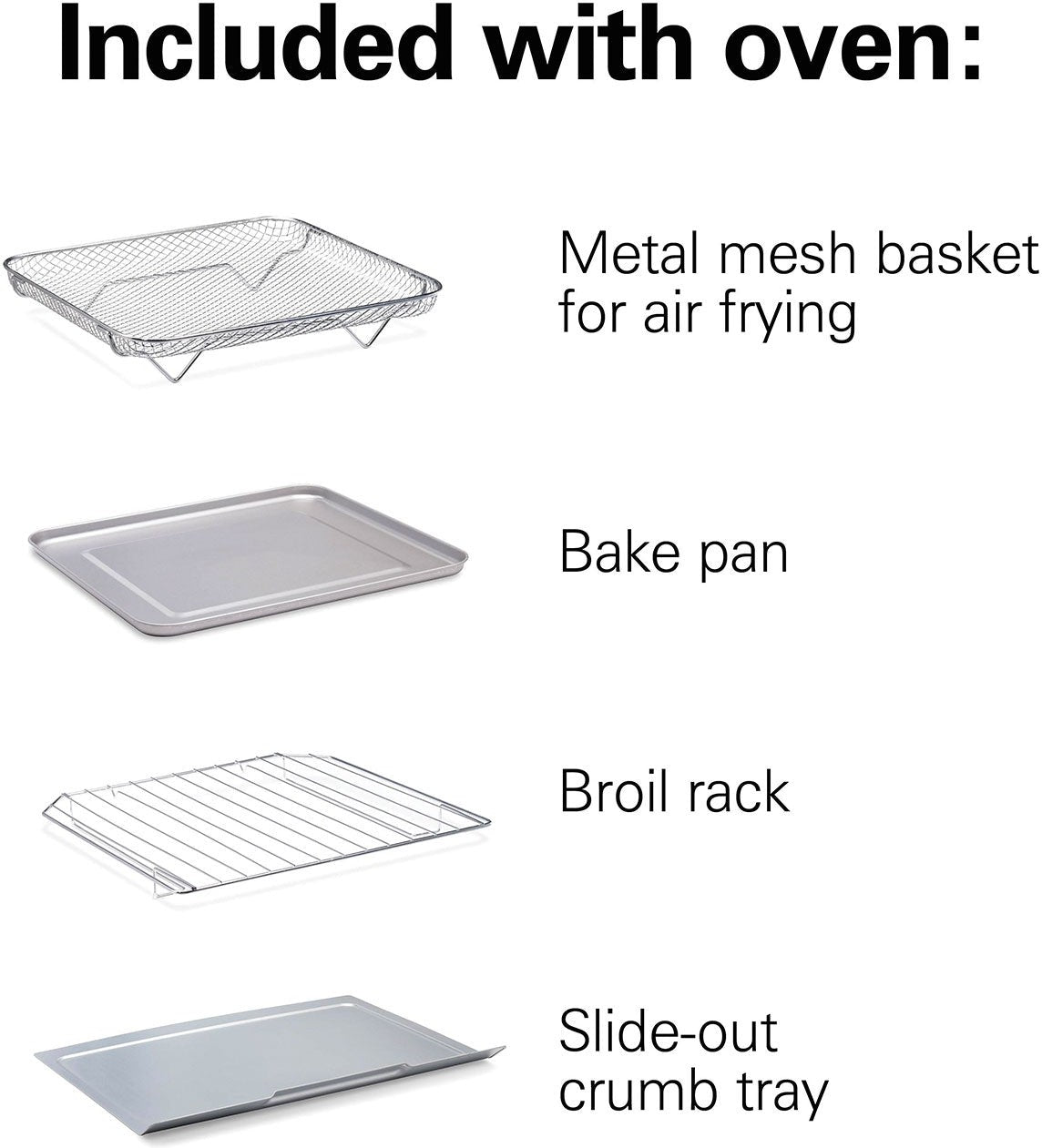 The Hamilton Beach® Sure-Crisp® Air Fryer Countertop Toaster Oven is your versatile kitchen companion, offering the convenience of air frying along with baking, broiling, and toasting capabilities. Whether you're cooking French fries, steak, or simply toasting bread, this appliance delivers even browning and crispiness with its powerful air circulation technology, using minimal oil for healthier meals. You'll appreciate the spacious interior that accommodates a whole 5 lb. chicken, 6 slices of toast, a 12” pizza, or a 9" x 11" baking pan with three adjustable rack positions. The oven operates with 1500 watts of power, ensuring precise temperature control from 150° to 450° F for consistent cooking results without hot spots. Its patented contoured control knobs are easy to grasp and turn, while the 30-minute timer with automatic shutoff and ready bell adds convenience. The stay-on setting allows you to extend cooking times as needed. The sleek stainless steel front enhances the look of any kitchen, complementing its functionality. Included accessories such as a mesh air fry basket, bake pan, broil rack, and removable crumb tray make cooking and cleanup a breeze.