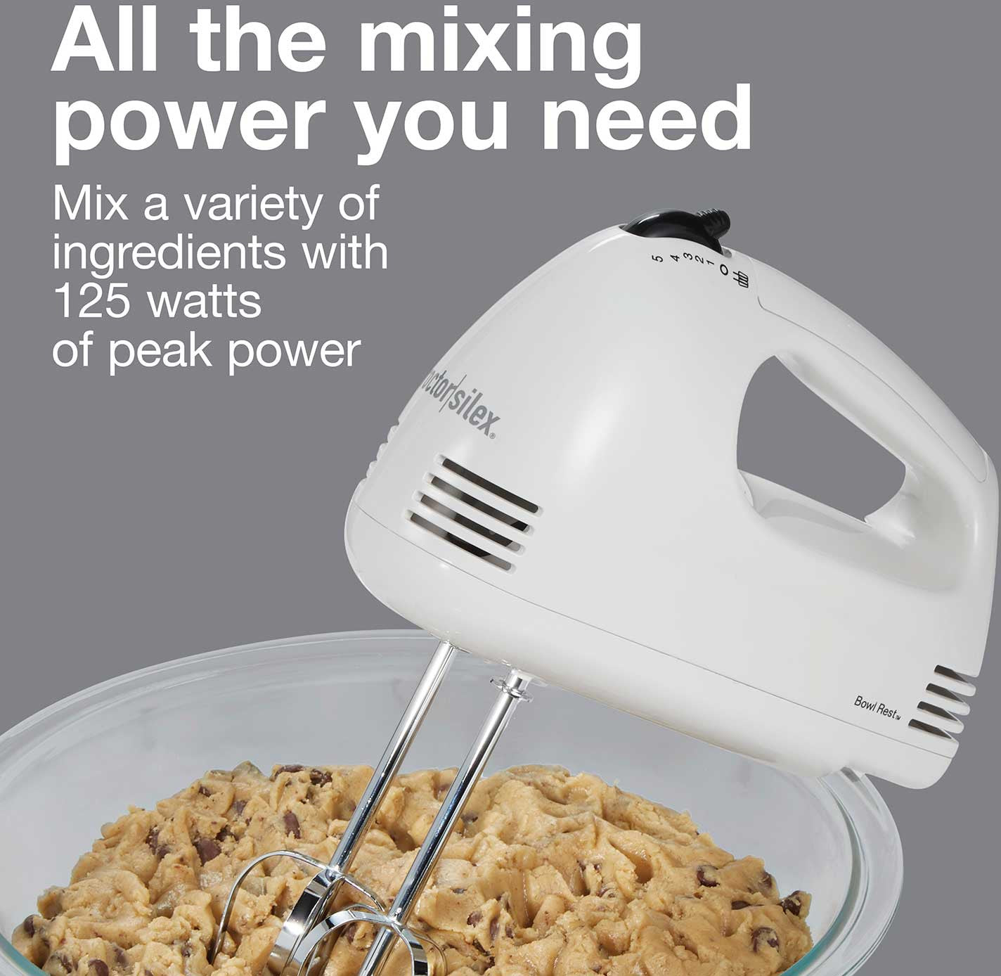 The Proctor Silex Commercial Easy Mix 5-Speed White Hand Mixer is a lightweight, compact, and affordable kitchen tool designed to handle a variety of mixing tasks with ease. Its 125-watt motor and five-speed settings provide versatility for mixing, stirring, beating, and whipping ingredients.