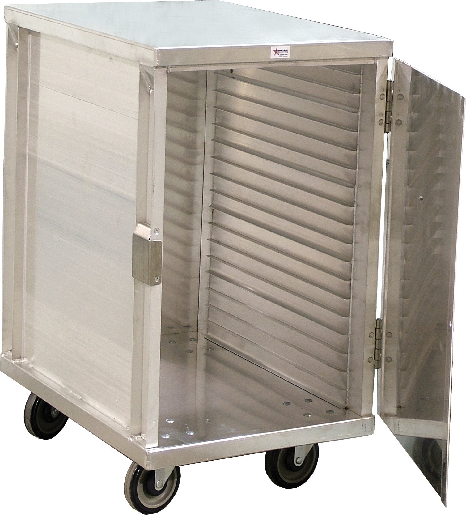 The door to this enclosed aluminum cabinet is supported by stainless steel hinges that allow it to open 270 degrees. 5" heavy duty casters allow for easy mobility. The spacing between the slides is 1.5" and the cabinet supports standard 18" x 26" pans.