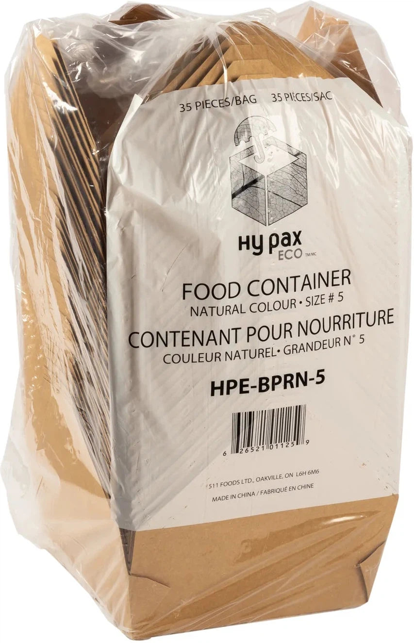 Hy-Pax presents the Natura Take Out Container, an environmentally conscious solution designed to accommodate full-course meals, whether it's lunch or dinner, large salads, bakery items, or substantial leftovers. With a generous 2.86-liter capacity, Size 5 is perfect for those who require a versatile, spacious, and eco-friendly option for their to-go meals. Crafted from environmentally friendly kraft paper with a PE lining, these containers offer an attractive, convenient, and affordable alternative to traditional plastic and foam containers. Hy-Pax Natura Take Out Containers offer an eco-friendly, spacious, and convenient solution for those seeking sustainable packaging options for their full-course meals. Upgrade to these containers to enjoy the benefits of both functionality and environmental responsibility.