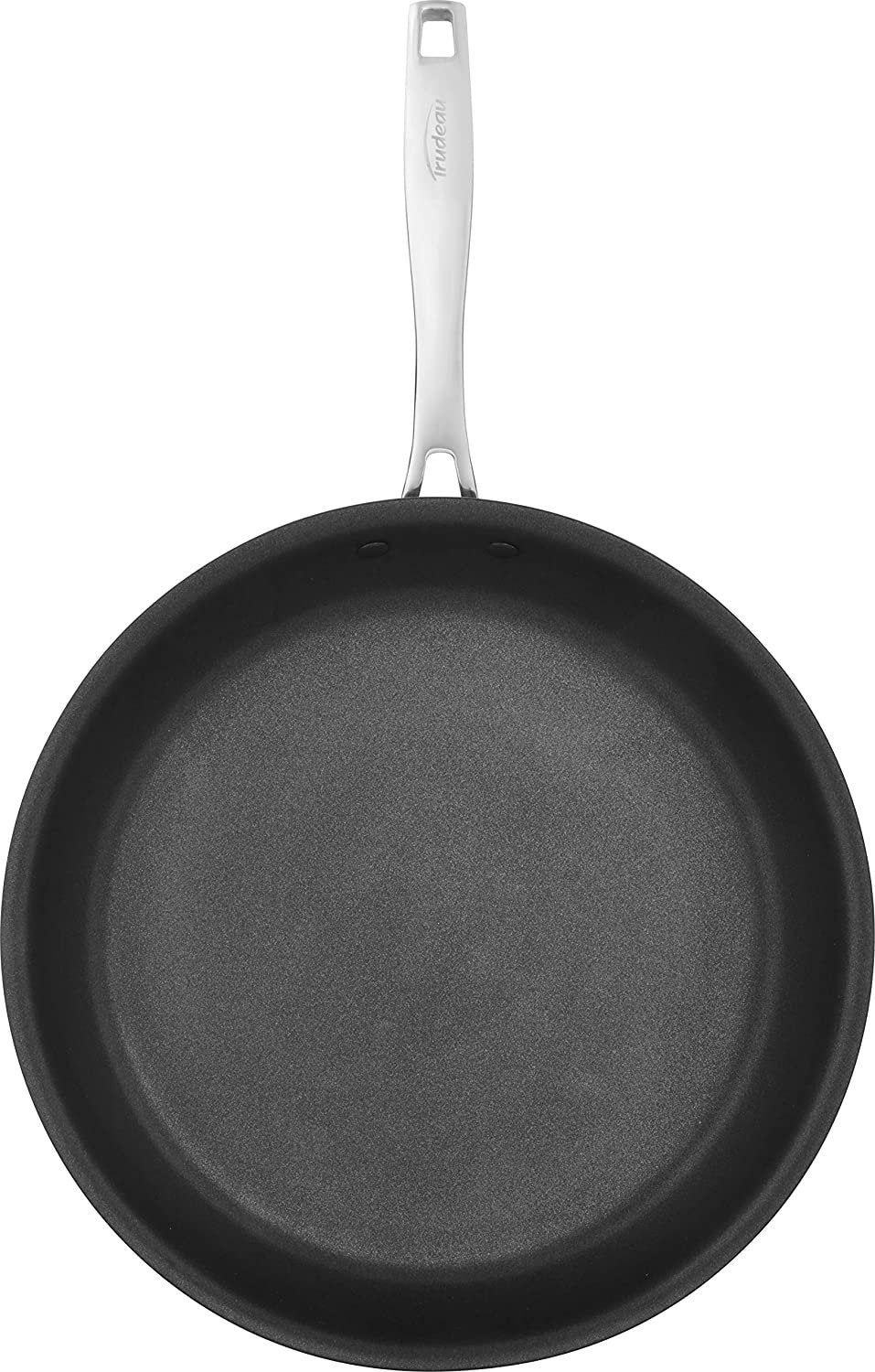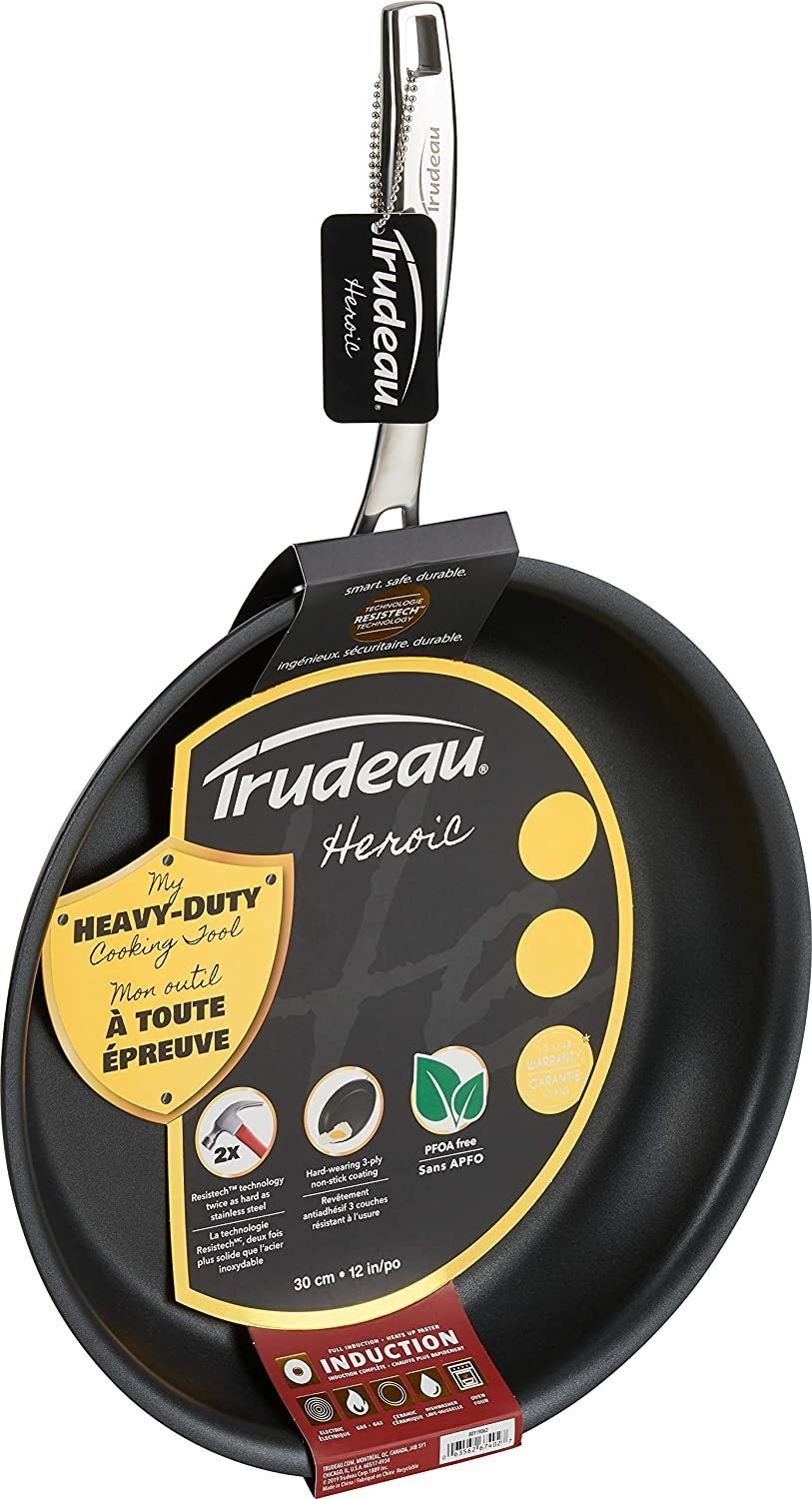 The Trudeau Heroic 12" Frying Pan features an induction base, hard wearing 3-ply non-stick coating and Resistech technology that ensures maximum fusion of the surface to the hard-anodized aluminum for a high level of durability. This heavy-duty pan is twice as hard as stainless and will not buckle or warp for years to come to ensure maximum longevity.