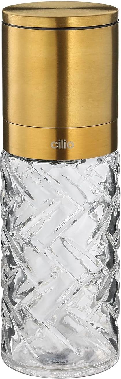 Enhance your kitchen with the Cilio Cristallo 6.7" Gold Glass and Stainless Steel Salt or Pepper Mill, a stylish and practical tool for precise seasoning. Designed with a durable ceramic grinding mechanism, this mill delivers consistent and efficient grinding of salt, pepper, and other dried spices, ensuring maximum flavor in every dish.