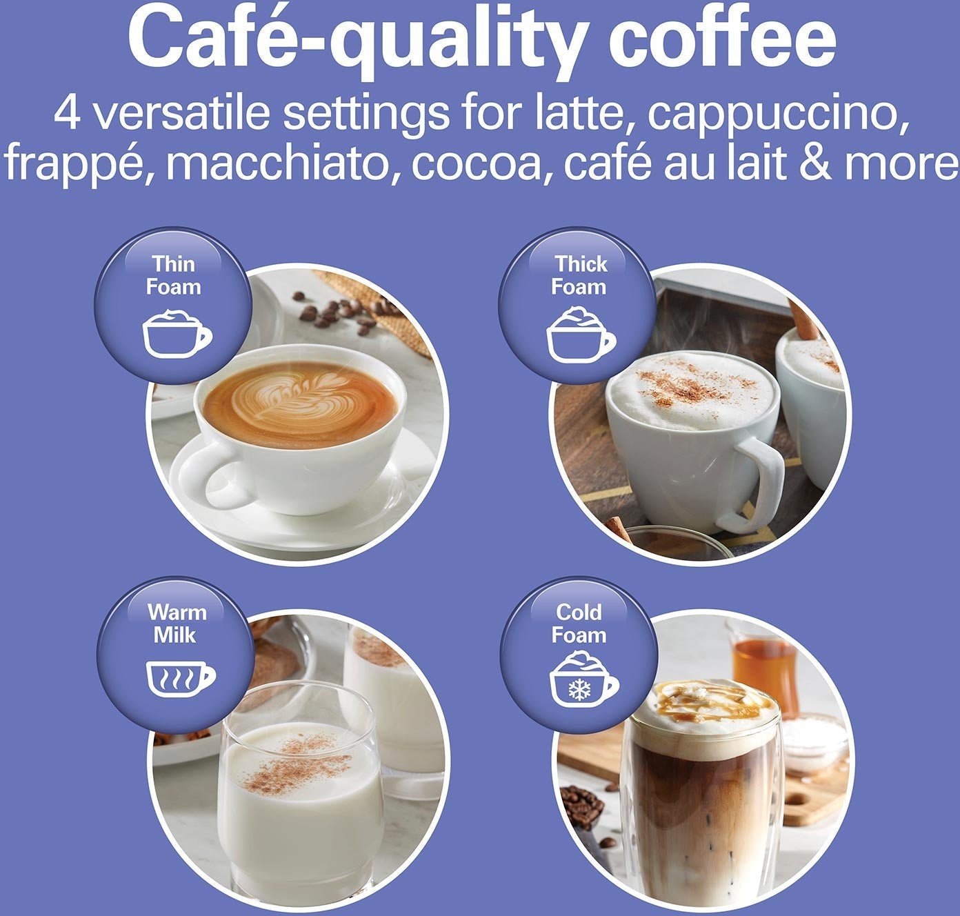 Versatile Settings: Choose from 4 settings to froth or warm milk for various beverages, including latte, cappuccino, frappé, macchiato, cocoa, and more.