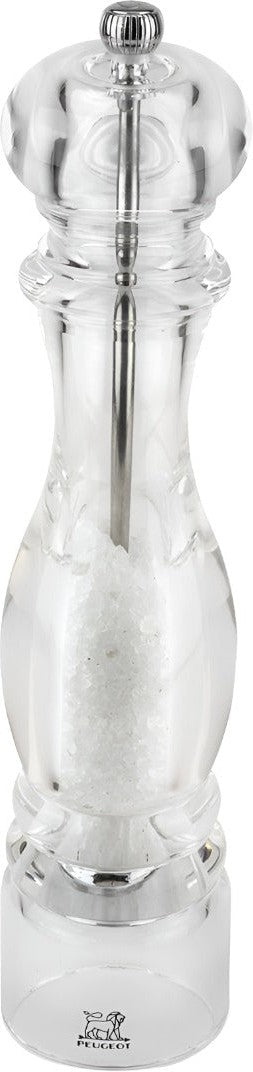 The familiar lines and total transparency make this Peugeot Nancy 12 cm salt mill an essential for the table and the kitchen. Produced entirely in acrylic it highlights its contents,the shining white salt & pepper.