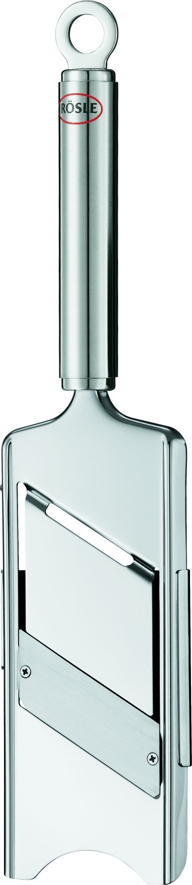 These Rosle kitchen utensils with round handles are filled with epoxy cement which seals the tool so water and germs cannot penetrate. The convenient hanging loop is great for storage. The sharp blade is freely adjustable and can be set to produce the desired thickness for each type of fruit or vegetable. Ideal for truffles so that these exquisite fungi can be extremely finely sliced. The Food Grip/Hand Guard ensures safe slicing even of small pieces.