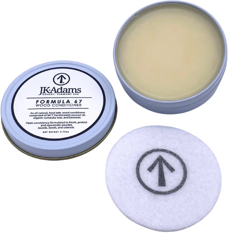 Applying the wood conditioner paste is quick and easy. Simply scoop a small amount of paste onto a clean, dry cloth or applicator pad and rub it into the wood in a circular motion, working with the grain for best results. Allow the conditioner to penetrate the wood for a few minutes, then buff off any excess with a clean cloth. For optimal results, repeat the application every few months or as needed to keep your wooden items in top condition. In addition to its use on wooden kitchenware and furniture, the Formula 67 wood conditioner paste can also be used on a variety of other wood surfaces, including cutting boards, salad bowls, butcher blocks, and wooden utensils. Its versatile formula makes it a must-have for anyone who wants to preserve and protect their wooden items for years to come. Overall, the "J.K. Adams - 3.75 Oz Formula 67 Wood Conditioner Paste Tin" is a high-quality wood care product that provides long-lasting protection and nourishment for your wooden items. With its natural formula, easy application, and beautiful finish, it's the perfect choice for anyone who wants to keep their wooden kitchenware and furniture looking their best.