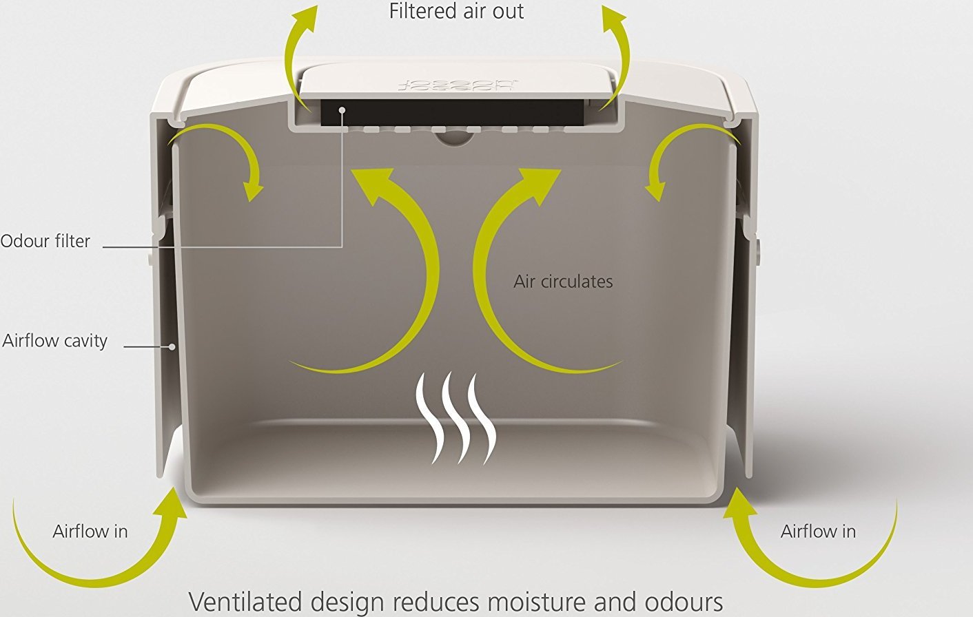 This clever food caddy has been carefully designed to help reduce the smell from collected food waste. It has a unique, ventilated design that allows air to enter and circulate inside the caddy, which helps to reduce moisture - the main cause of unpleasant odours from decomposing food. The Stack 4 food caddy features a replaceable odour filter in the lid that works in tandem with the fresh air to help trap any smells that do occur. It has an easy-clean polypropylene body, a flip-top lid and a sturdy stainless steel carry handle. A liner-retaining hole inside ensures any liners stay in place and the rim of the removable lid hides any untidy bag overhang. Perfect for storing on a kitchen worktop, it is also compatible with our Stack recycling separation system. Wipe clean with a damp cloth. Capacity: 4 litres (1 US gallon).