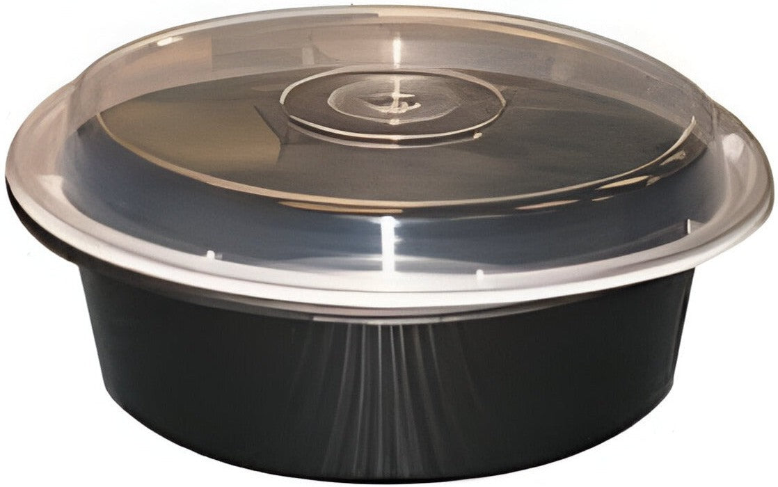 Kari-Out - 40 Oz Medium Round Black Plastic Containers with Lid Combo, 150/Cs - MT0910B