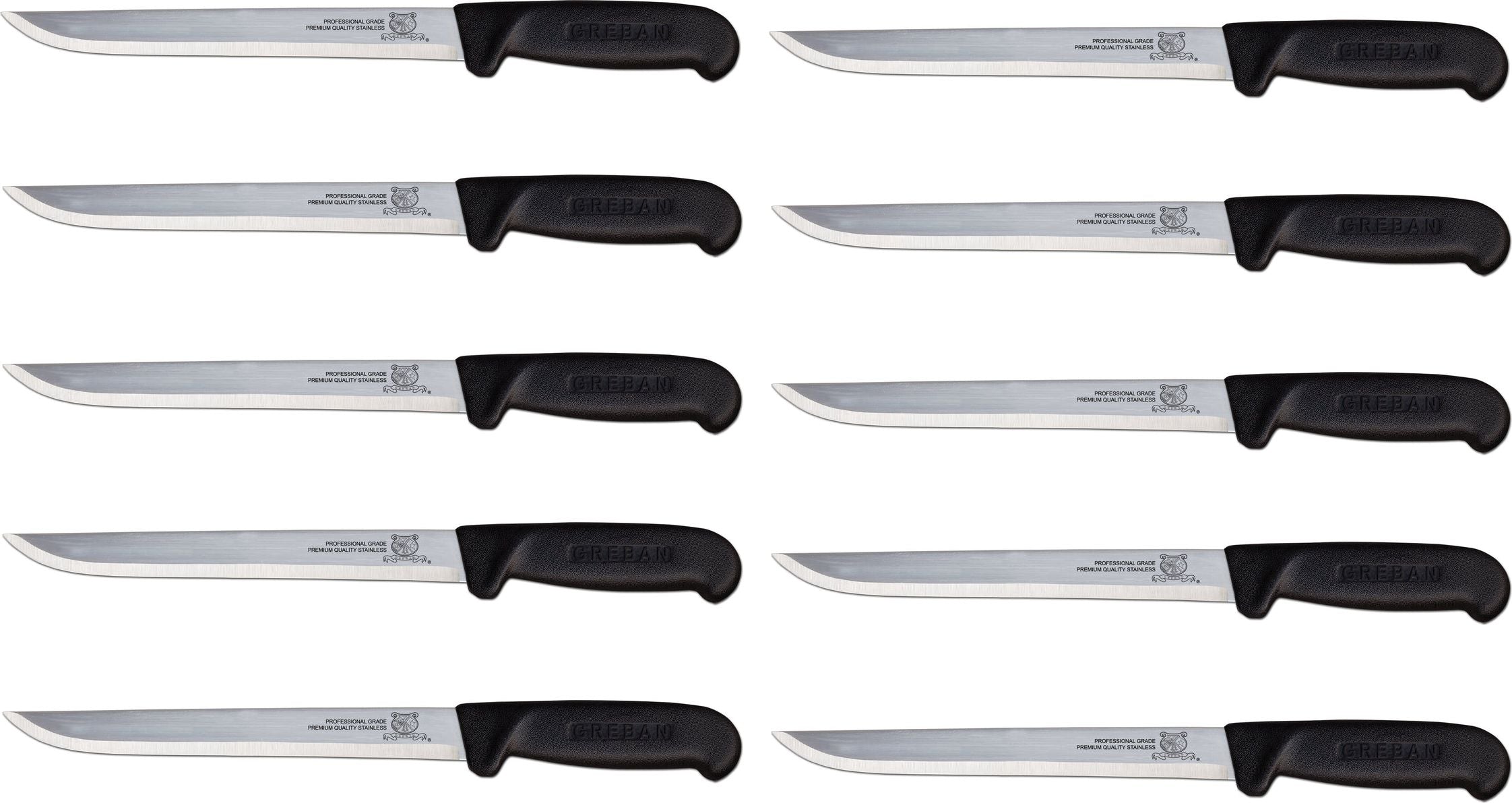 This Greban knife is made of premium quality stainless steel. Its 8" light gauge straight blade glides easily with control and aids in filleting. It allows the blade to move easily along the backbone and under the skin of meat.