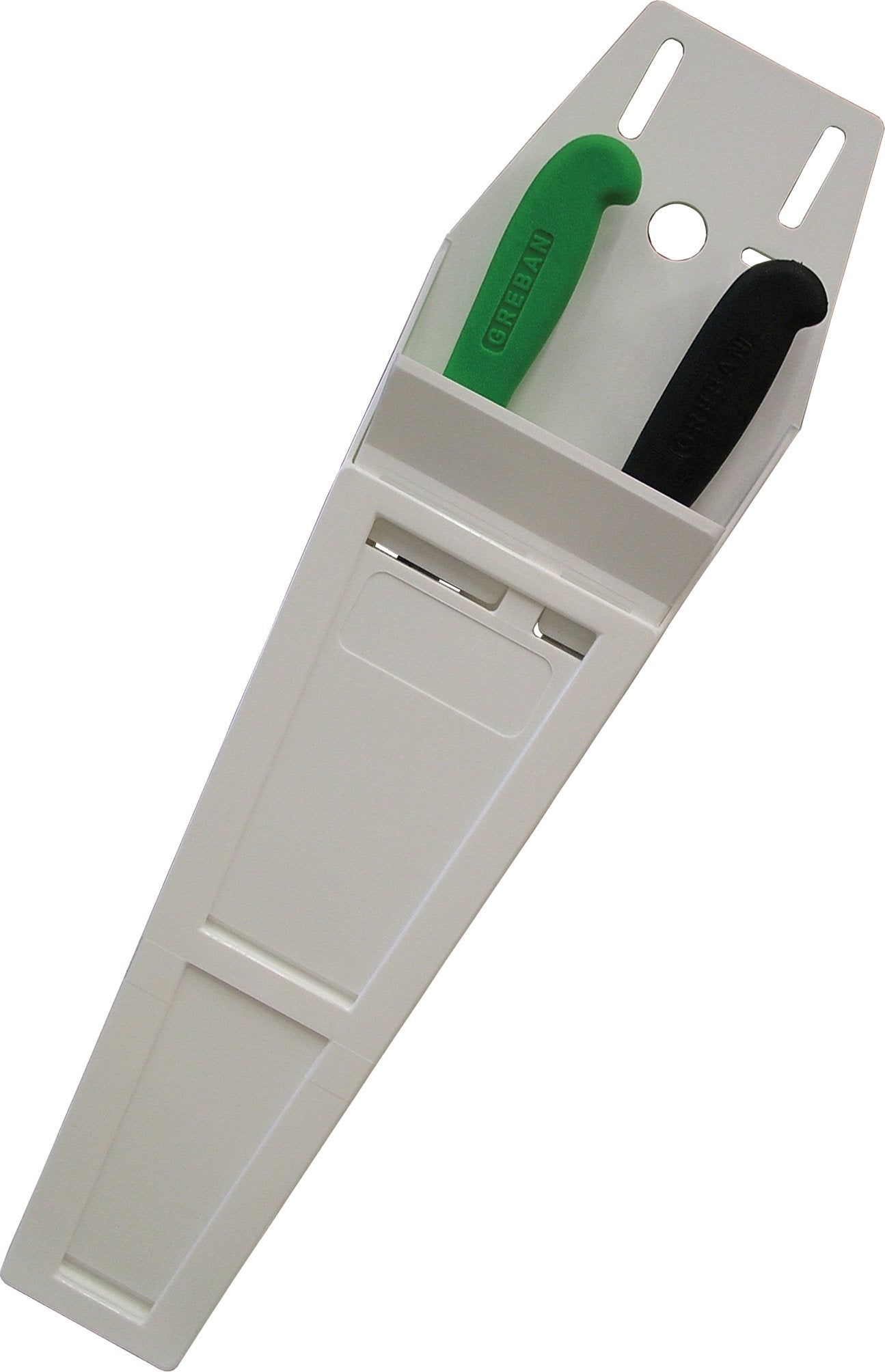 Clips for hanging. Dishwasher safe for easy cleaning. Slotted for belt attachment. Knives are sold separately.