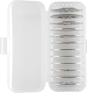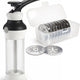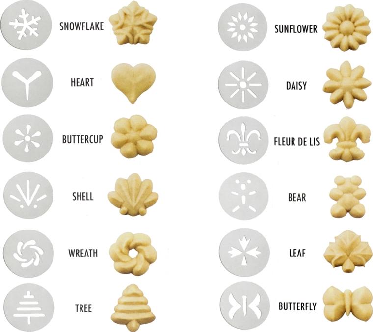 Make consistently shaped cookies with a simple pump of the large, comfortable lever. Disassembles for easy loading and cleaning. 12 stainless steel patterned disks included: Daisy, Flower, Sunflower, Fleur-de-lis, Butterfly, Bear, Shell, Leaf, Heart, Snowflake, Tree and Wreath. Press: 5.75" x 2.75" x 10.25". Storage Case: 2" x 5" x 2.1".