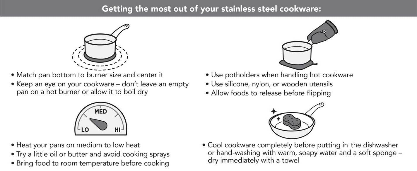STOVETOP TO OVEN: Induction compatible stainless steel cookware set with layered construction is broiler safe and oven safe to 500°F for adaptability to a wide range of creative cooking techniques.
