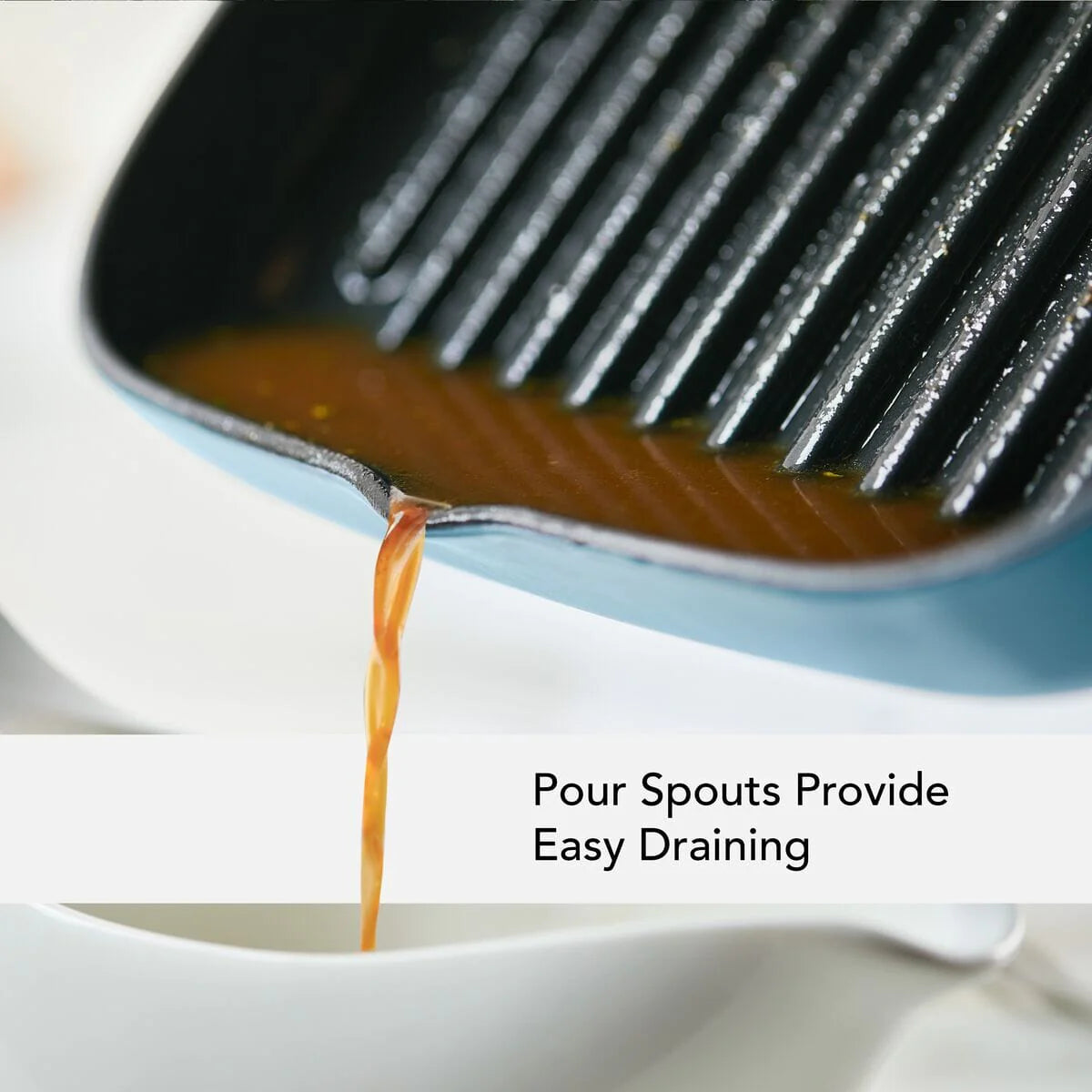 With its roomy square design and built-in handles, this grill pan is not only functional but also stylish. It seamlessly transitions from the oven to the table, making it an ideal oven-to-table serving dish. The enamel coating on this grill pan eliminates the need for seasoning and allows for easy cleaning with soap and water. Say goodbye to the tedious maintenance associated with traditional cast iron pans and enjoy the convenience of a pan that is ready to use whenever you need it.