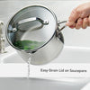 STRAINING LIDS: Tempered glass lids lock in heat to bring the most out of every ingredient; saucepan lids feature built-in strainers to strain liquids without the need of a colander.