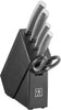 Set includes: 3" Paring Knife; 5" Serrated Utility Knife; 6" Utility Knife; 8" Chef's Knife; Kitchen Shears; and black 5-slot hardwood knife block.