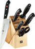 Lighter than bolster knives and an excellent choice for the ambitious hobby chef, ZWILLING Tradition is precision stamped from our high-performance "NO STAIN" stainless steel. Featuring an ergonomic 3-rivet handle with an embedded TWIN logo, these knives deliver exceptional value without compromising quality or performance. The handy ZWILLING knife block set provides you with all the basic knives which you can use to prepare your favorite recipes and enjoy making new creations. This set includes 4" Paring Knife (100 mm), 8" Chef's Knife (200 mm), 8" Bread Knife (200 mm), 6" Utility Knife (160 mm), Sharpening Steel, Kitchen Shears, and Natural Knife Block.