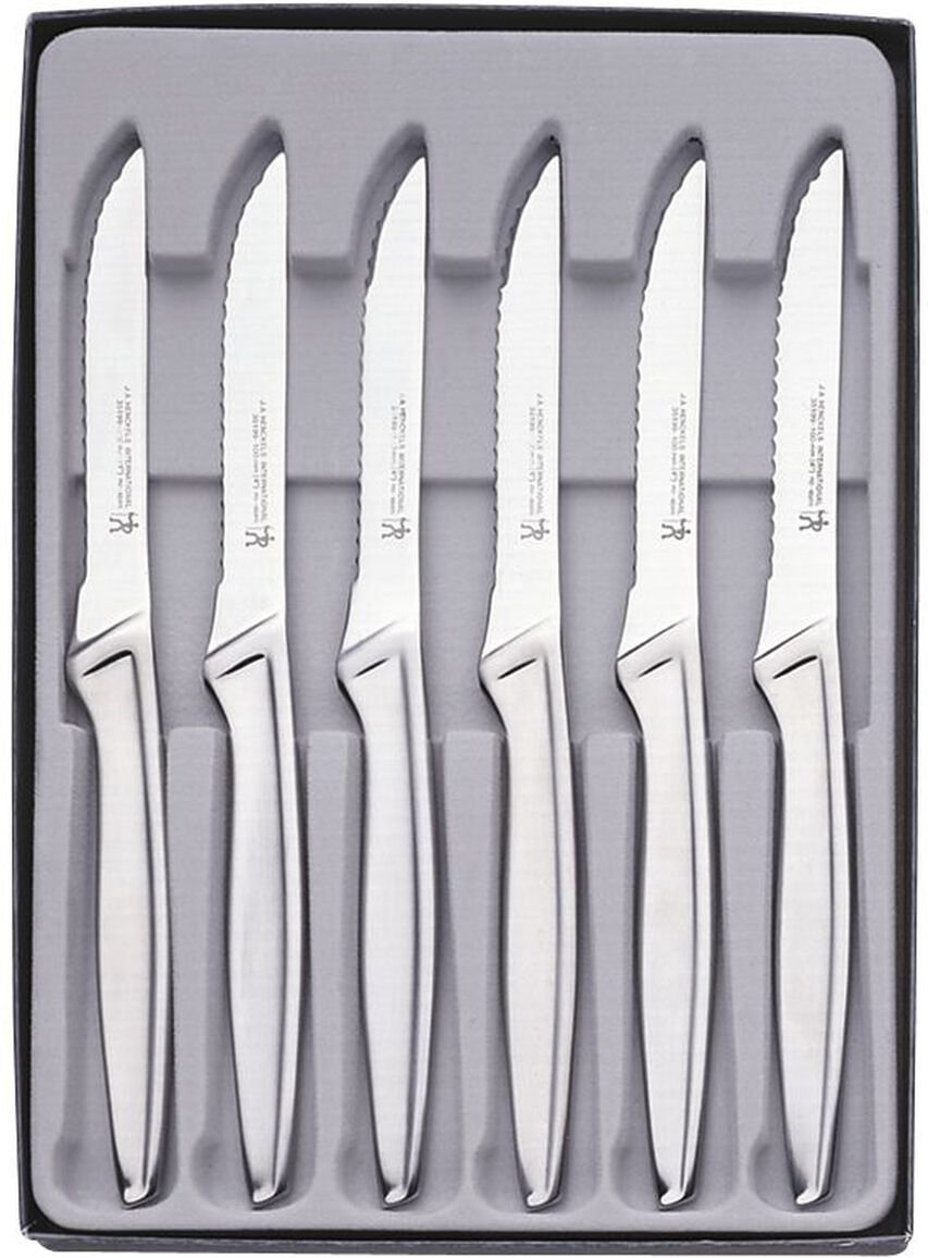 The HENCKELS stainless steel steak knives are great for any occasion where a steak knife is needed and will complement all flatware styles. The knives feature ergonomic handles with serrated blades that cut easily through meats. Set Includes 6 Pieces.