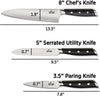 - Comprehensive 3-Piece Set: Includes an 8-inch Chef's Knife, 5-inch Serrated Utility Knife, and 3.5-inch Paring Knife, covering a wide range of kitchen tasks.