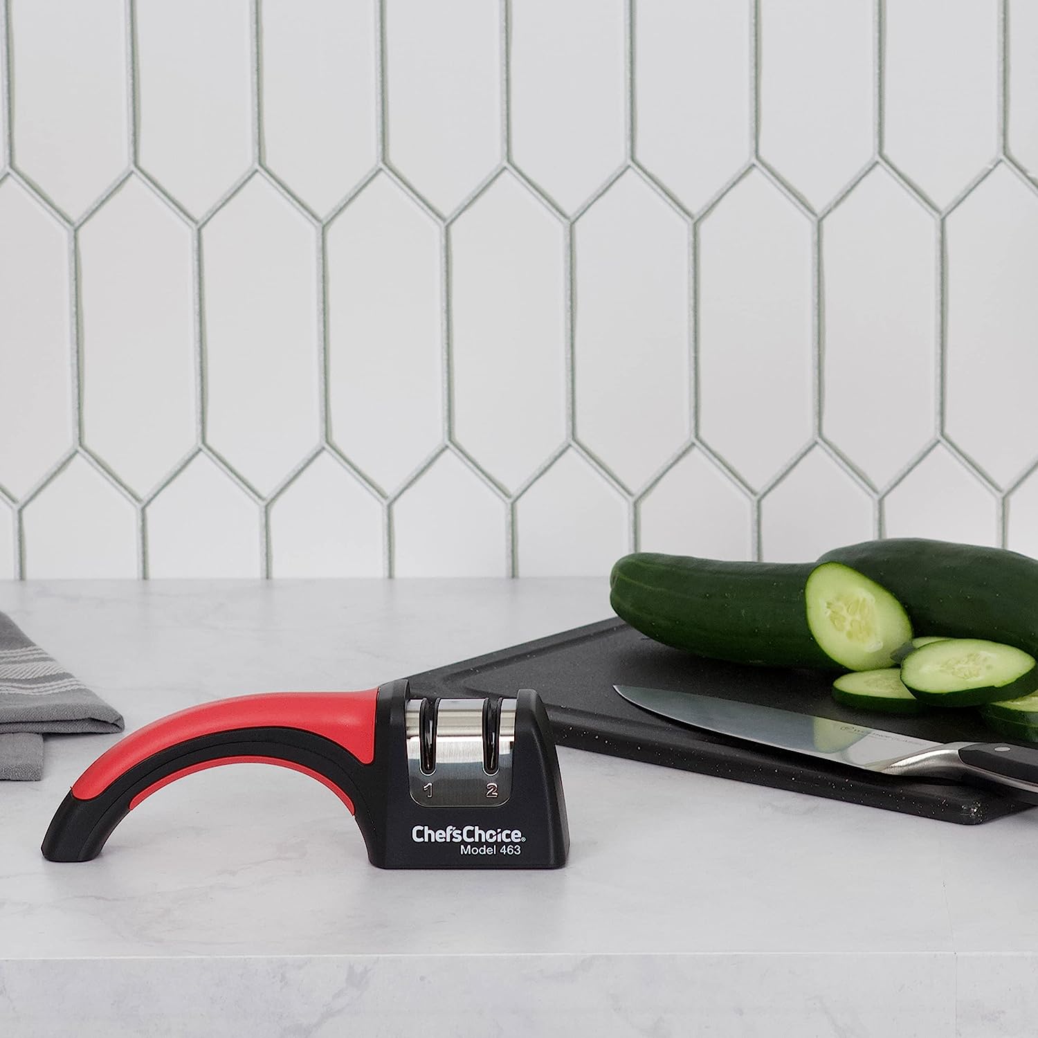 The Chef’sChoice Pronto Manual Diamond Hone Sharpener 463 is affordable, easy to use, quiet and extremely fast. It will put a flawless, extremely sharp, better than factory 15 degree edge on 15 degree class knives, including Santoku and other Asian-style double-sided knives contemporary Euro/American style knives. The Chef’sChoice #463 helps prolong the life of quality knives because it creates a super sharp 15˚ double-bevel arch-shaped edge that resists dulling longer than conventionally sharpened hollow-ground or “V-shaped” edges. Its fast and the edge that it applies is razor sharp and long- lasting with a “bite” that slices smoothly through both fibrous and non-fibrous foods.