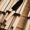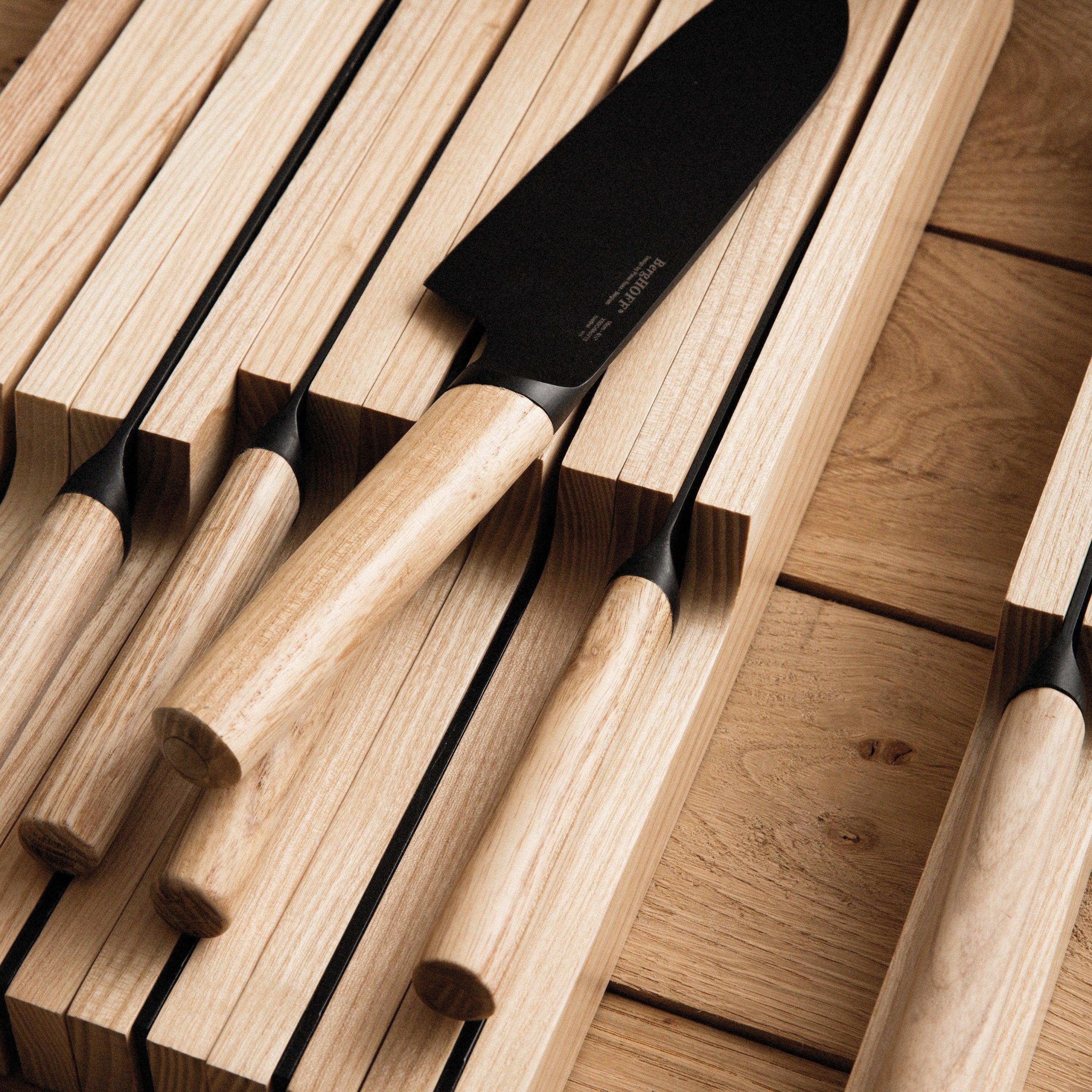 Your own custom knife storage, in a drawer or on a countertop. Connecting individual organizers together is easy thanks to the strong invisible magnet. Unique design allows for convenient access to all the knives: they are kept organised and ready to use. The knives are safely stored without damaging or dulling the blades. Made from ash wood; a very durable wood. Use this organiser for knives smaller than 15 cm.