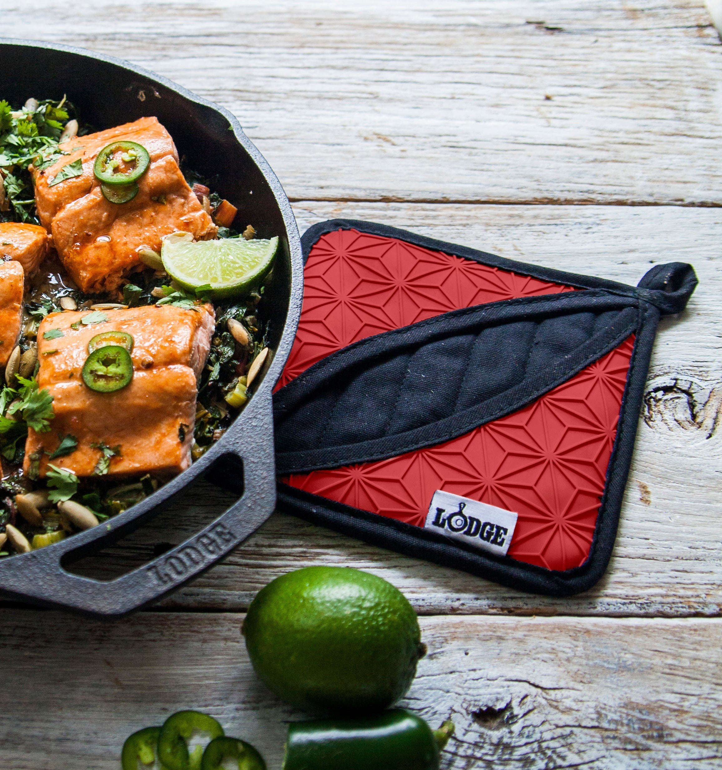 Protect hands and surfaces in style with this silicone and fabric potholder. The fabric lining provides a comfortable grip while the silicone exterior offers maximum heat and stain resistance.