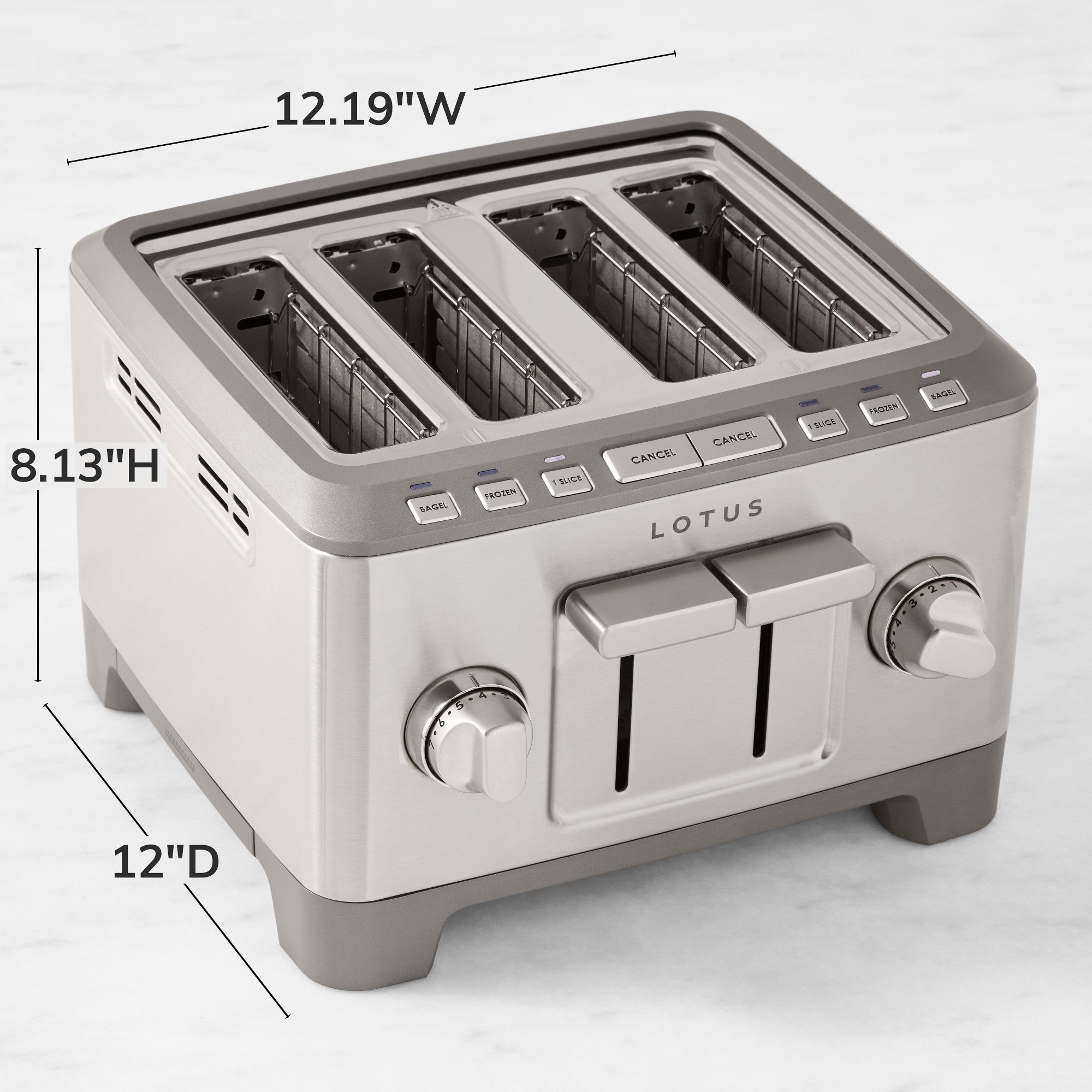 - Four extra-wide slots accommodate bagels, brioche, thick-sliced bread, and waffles