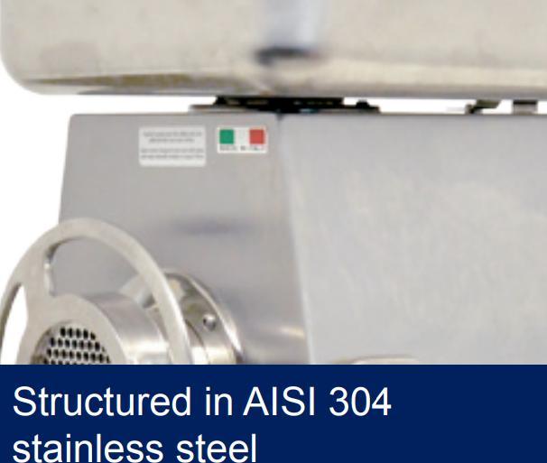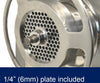 The MG-IT-0032-C heavy-duty meat grinder/mincer offers a great value with a proven record of dependability and performance. This electrical meat mincer is entirely made of high quality stainless steel, equipped with a safety micro switch, larger tray, hand protection and features high performance 1/4" plate and European-style knife. Ideal for any restaurant, deli or small butcher shop.