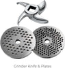 The grinder comes with a variety of accessories including a patented auger grip stomach, stainless steel plates for coarse (0.276 in) and fine (0.177 in) grinds, and a grinding knife.