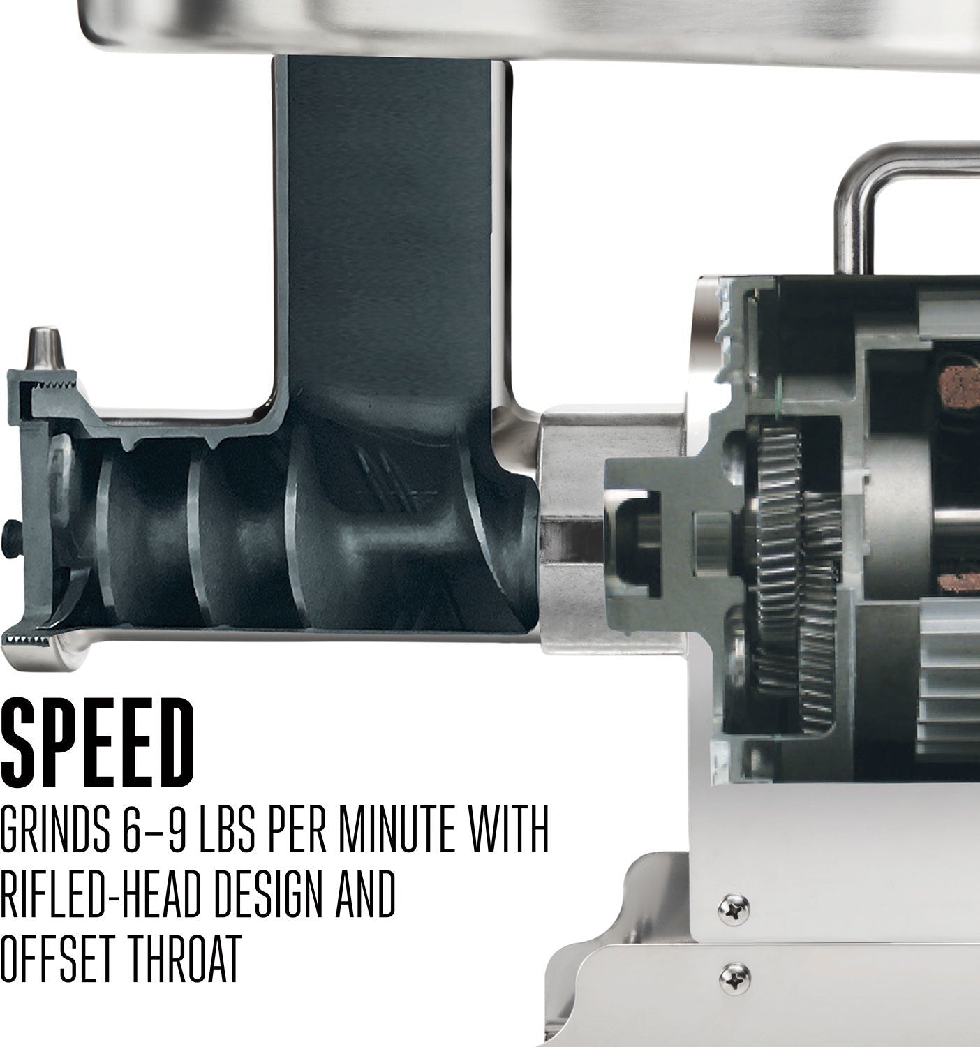 The electric meat grinder is designed for speed with a fluted head and offset throat design. It grinds 6-9 lbs. of meat per minute.
