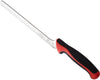 The Mercer Ultimate White 8" Japanese Steel Wavy Edge Offset Bread Knife with a distinctive Red Handle. Crafted for precision and performance, this bread knife is designed to elevate your culinary experience with its unparalleled features. Boasting a color-coded handle, this knife facilitates dedicated use applications, aiding in better food safety handling practices. Its one-piece construction from high-carbon Japanese steel ensures easy edge maintenance and rapid sharpening, guaranteeing a consistently razor-sharp edge for effortless slicing. The raised Santoprene® textured handle not only offers vastly improved grip but also enhances comfort during prolonged use. Meanwhile, the wavy edge, featuring teeth along the blade, effortlessly penetrates tough outer crusts or skins of various foods, safeguarding the soft inner parts from tearing. For added safety and convenience, this knife is equipped with textured finger points that provide slip resistance, grip, and security, along with a protective finger guard. Moreover, its ergonomic handle, crafted from a combination of Santoprene® for comfort and polypropylene for durability, ensures a comfortable and secure grip for precise cutting every time. Elevate your culinary prowess with the Mercer Ultimate White 8" Japanese Steel Wavy Edge Offset Bread Knife, an essential tool for professional chefs and home cooks alike.