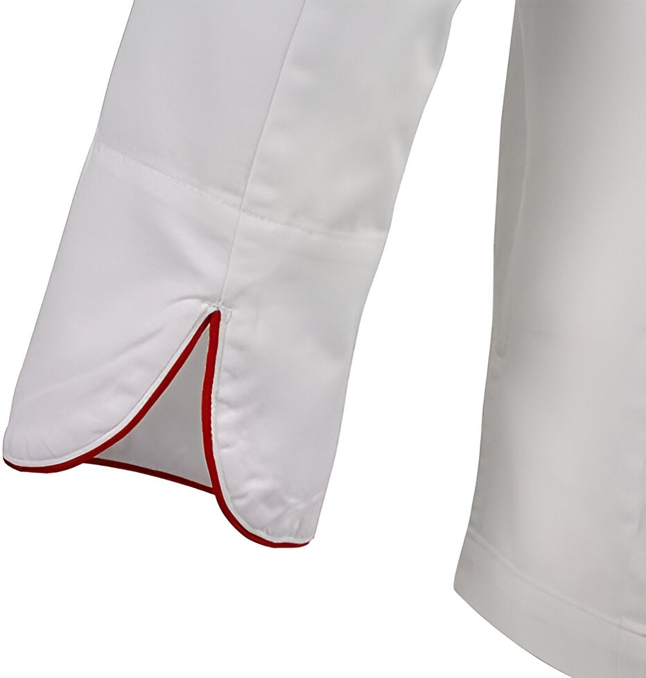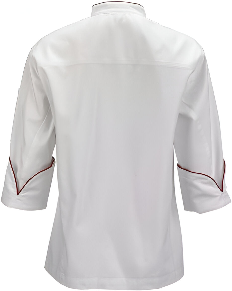 Mercer - Renaissance Poly Cotton White Women's Scoop Neck Chef Jacket with Red Piping on Neck and Cuffs - M62045WR