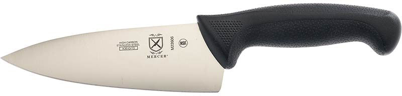 The Mercer Millennia 6" Japanese Steel Chef's Knife with Black Handle, a pinnacle of precision and comfort in culinary craftsmanship. Crafted from a single piece of high-carbon Japanese steel, this knife embodies effortless edge maintenance and swift sharpening, ensuring a consistently razor-sharp blade for flawless cutting every time. Designed with your comfort and safety in mind, the handle features raised Santoprene® texturing, providing enhanced grip and unparalleled comfort during prolonged use. Textured finger points further augment slip resistance, offering optimal control and safety while handling. For added peace of mind, a protective finger guard is integrated into the design, safeguarding against accidental slips and ensuring utmost safety in the kitchen. Combining the best of both worlds, the ergonomic handle is a fusion of Santoprene® for luxurious comfort and polypropylene for enduring durability, promising years of reliable performance. Elevate your culinary experience with the Mercer Millennia 6" Japanese Steel Chef's Knife – where precision meets comfort and safety for unparalleled culinary excellence.