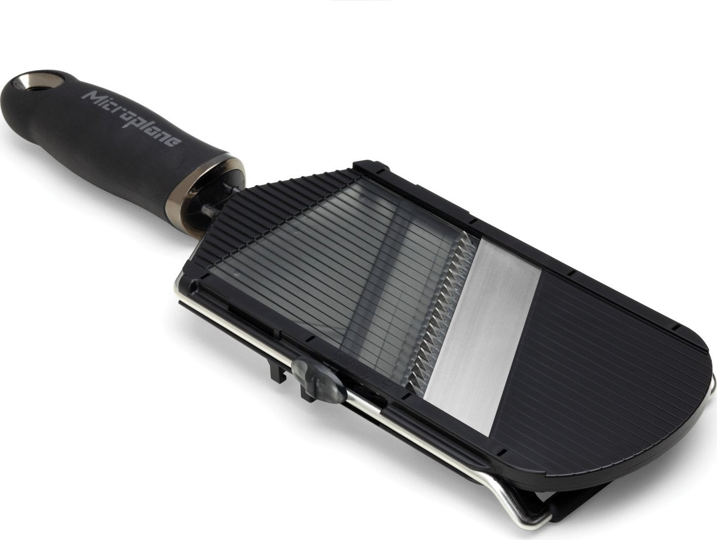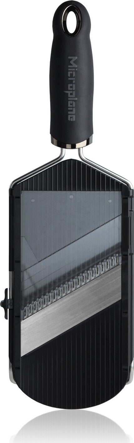 The Microplane® Adjustable Slicer offers a long-lasting, ultra-sharp, stainless steel straight blade and also includes a julienne blade. The straight-edge blade cuts paper-thin to thick slices using three settings on adjustable knob. Switch to the julienne blade for long, thin, even strips perfect for pastas and salads.